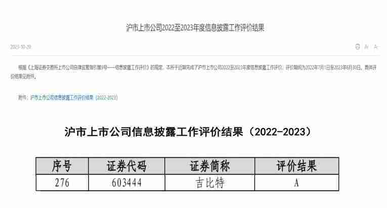 近日,,上海证券交易所(以下简称“上交所”)发布2022-2023年度信息披露工作评价结果。。。一竞技(股票代码::603444)凭借规范的公司治理、、、、高质量的信息披露以及良好的投资者关系管理再次荣获信息披露工作A级评价,,,,公司连续两年获此殊荣。。