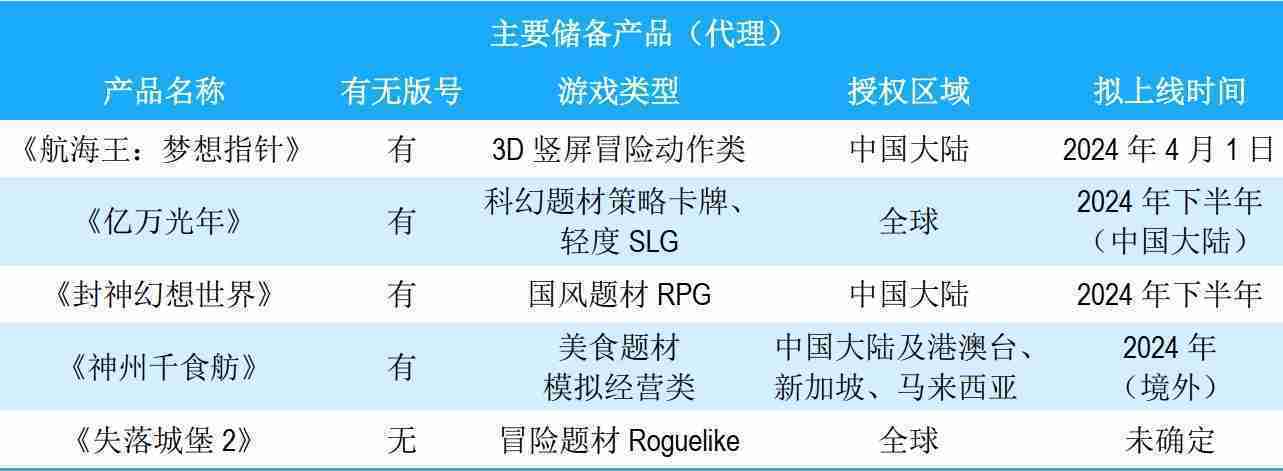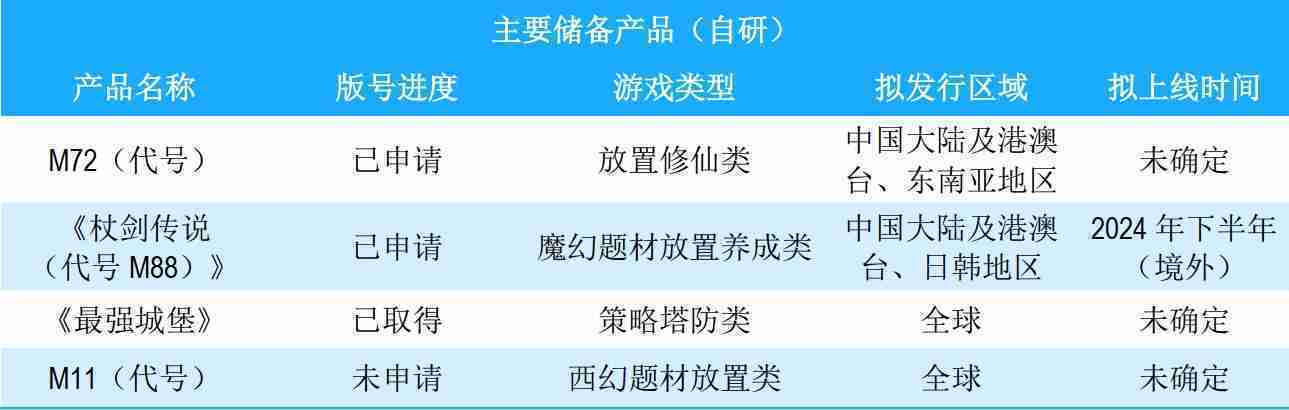 公司储备的多个自研、、代理产品都在有序推进当中,,,,涵盖放置类、、策略类、、、模拟经营类、、RPG、、、Roguelike等多元化游戏品类,,储备的主要自研和代理产品如下::